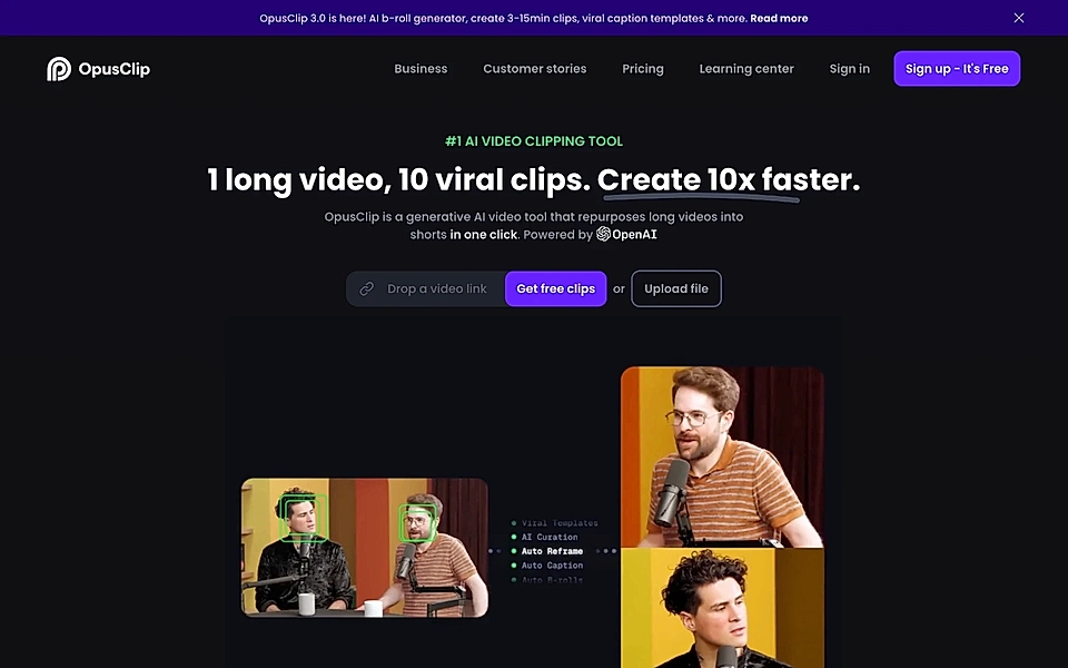 Opus Clip’s hero is a fantastic example – I love the call-to-actions to drop a link to a video and upload a file.