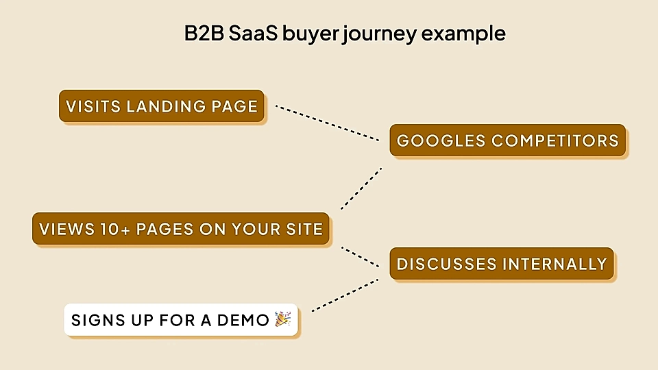 A growth marketing expert, Gaetano Nino DiNardi, posted a great B2B buying journey example on LinkedIn. In summary, the lead who first visited a Google Ads landing page had 23 subsequent digital interactions (page visits and a chat message) before conversion (a demo call).