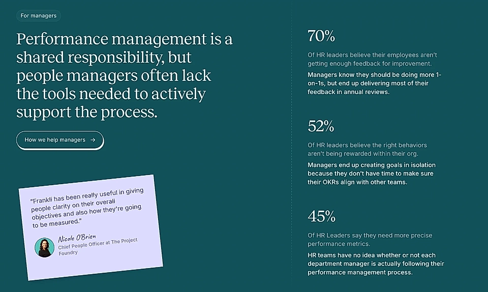 In the website hero section, Frankli promises to simplify performance reviews and management for HR teams.