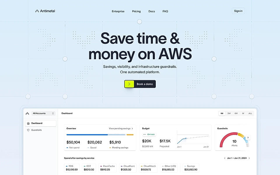 Antimetal’s hero goes straight to the point – ‘Save time & money on AWS’ resonates with all SaaS developers and product teams that have chosen AWS for their growing businesses.