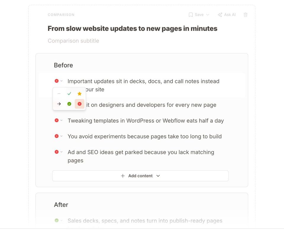 The comparison element can also be used for other purposes, such as comparing your product to alternatives or competitors.