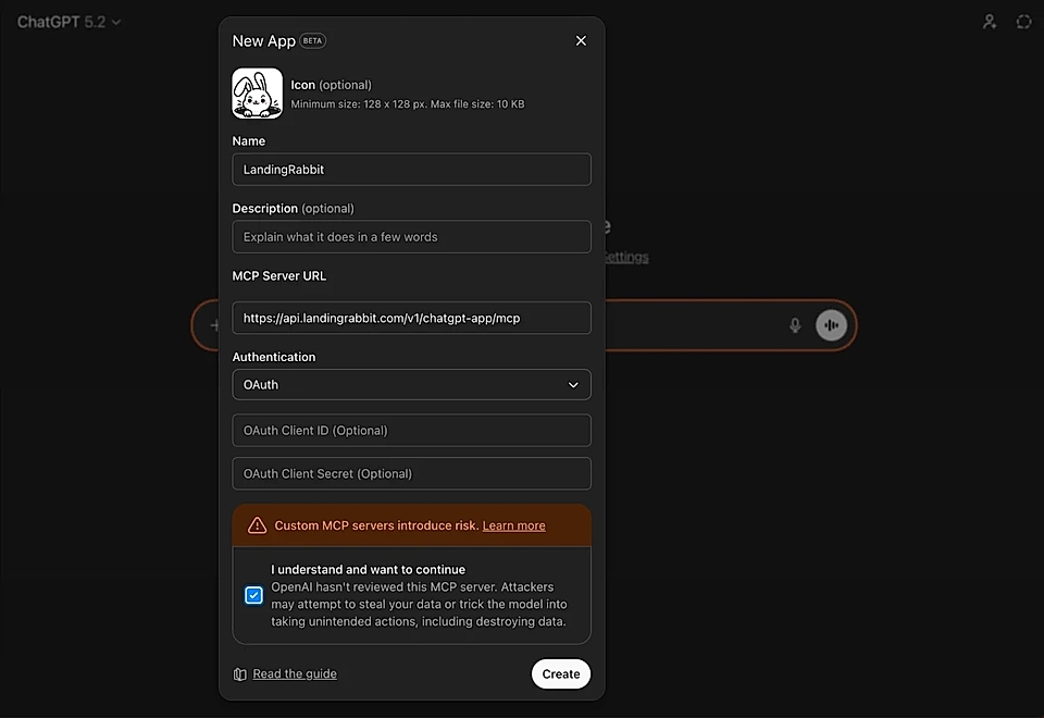 Once approved, ChatGPT can now create and manage content inside LandingRabbit.