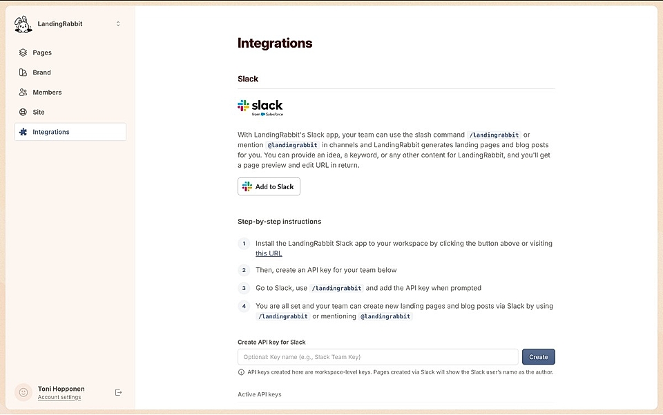 After adding the API key, everyone in your team can use /landingrabbit in any of the Slack channels or mention @LandingRabbit in threads.
