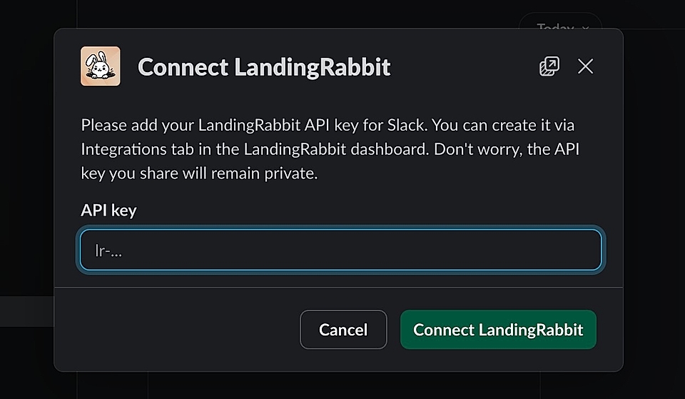 Then, use /landingrabbit in Slack. Say Hello to LandingRabbit, and you'll be prompted for the API key
