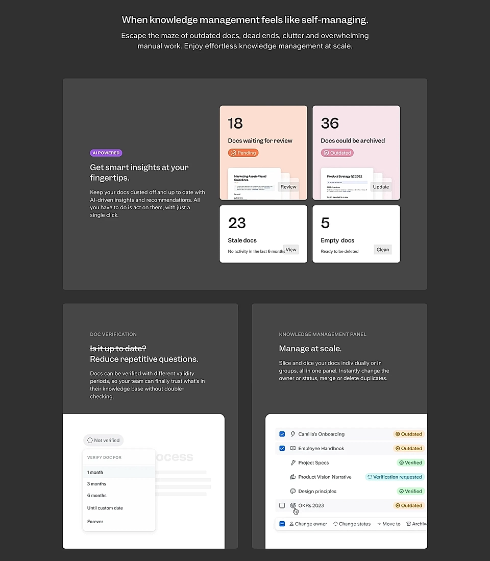 Slite is designed for remote and growing teams who currently use knowledge management tools like Notion or Confluence but struggle with outdated or disorganized information. Slite provides an AI-powered knowledge base that automatically organizes and updates company documents. Key features include AI-powered search, document verification, and real-time collaboration. This helps teams keep a single source of truth, cut down on repetitive questions, and work more efficiently.